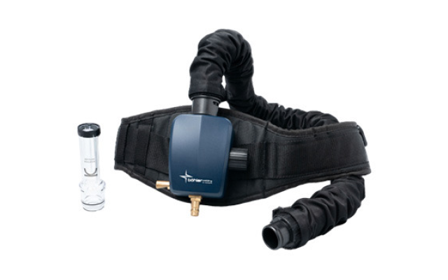 Respiratory system for pressured air supply including flexible air hose, comfort belt and airflow tester.