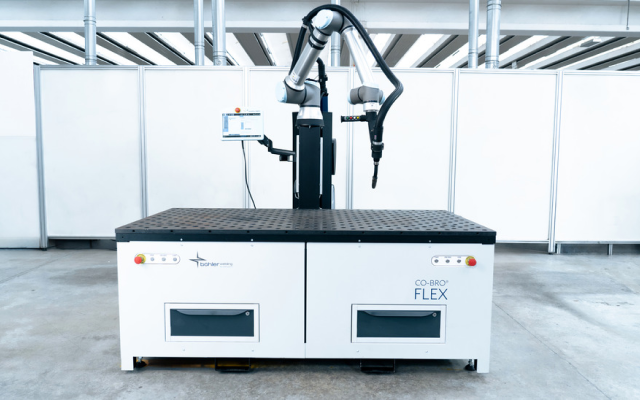 CO-BRO® FLEX is a high-tech workstation for robotic collaborative MIG-MAG welding with a comprehensive and intiutive software interface that integrates the lates generation of the URANOS NX 5000 PME welding generator from Böhler Welding, the collaborative robotic arm and all accessories. The collaborative robot concept, flexibility, all-round accessibility, and extremely simple programming make the difference here.